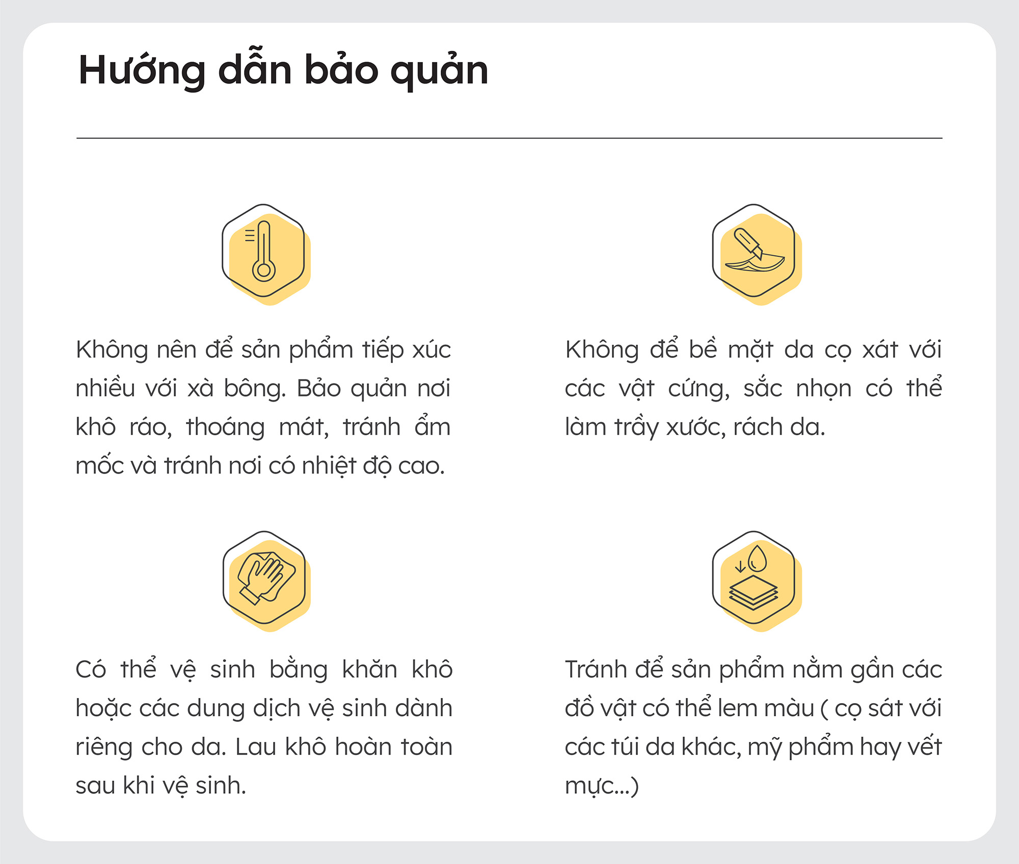 - Có thể vệ sinh bằng khăn khô hoặc các dung dịch vệ sinh dành riêng cho da