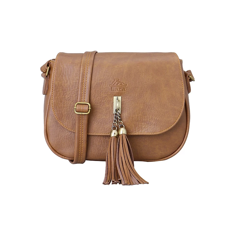 Túi Đeo Chéo Thời Trang Nữ LATA HN29 - Da Bò Nhạt có kiểu dáng hình chữ nhật ngang được bo cong mềm mại ở các góc, phía trước trang trí bằng móc treo tua rua sành điệu giúp tôn lên vẻ ngoài thanh lịch và trẻ trung cho người sử dụng. Túi được gia công từ chất liệu da tổng hợp với độ bền cao, chống sờn rách hay bong tróc nhằm duy trì tuổi thọ dài lâu. Tông màu trung tính cổ điển của túi giúp bạn gái dễ dàng kết hợp với nhiều trang phục ngày thường để đi học, đi làm hay dạo phố.
