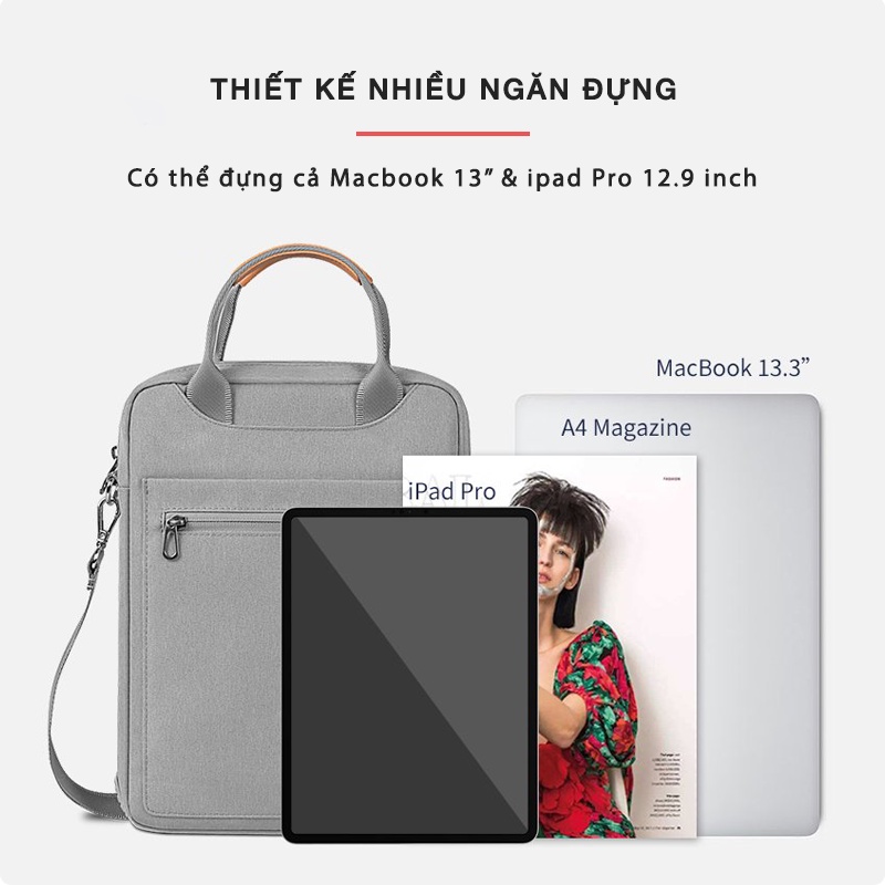 - Túi có 2 năn chính: 1 ngăn đựng máy và 1 ngăng đựng ipad hoặc sổ sách tài liệu A4