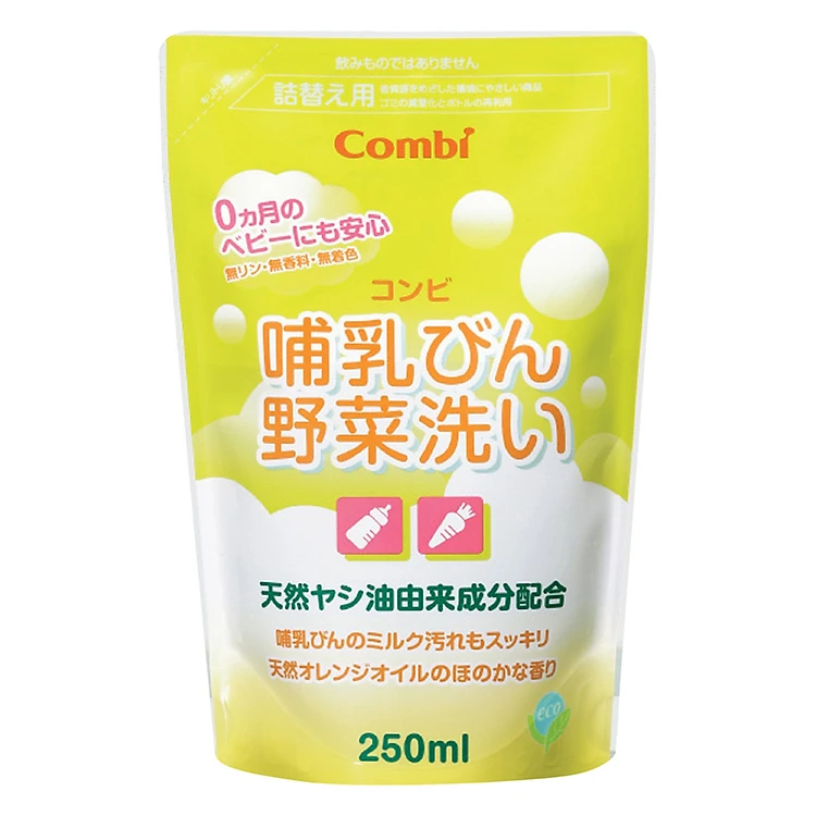 - Túi Dung Dịch Rửa Bình Sữa Và Rau Quả Từ Dầu Cọ Combi (250ml) chiết xuất từ dầu cọ tự nhiên: Có tác dụng làm sạch hiệu quả mà vẫn đảm bảo an toàn tuyệt đối cho bé và mềm mại da tay cho mẹ. Không chứa chất tạo màu, không phốt-pho.