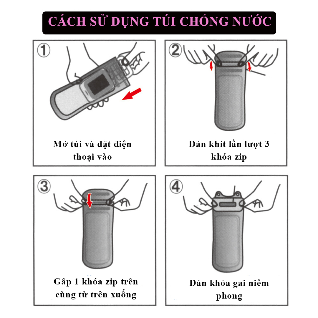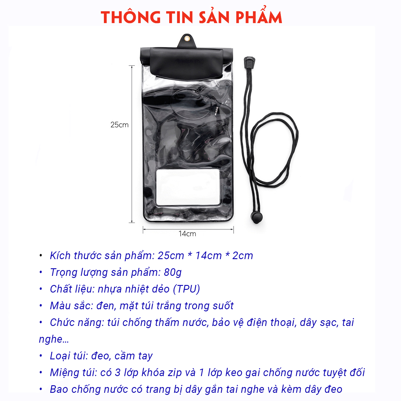 • Chức năng: túi chống thấm nước, bảo vệ điện thoại, dây sạc, tai nghe…