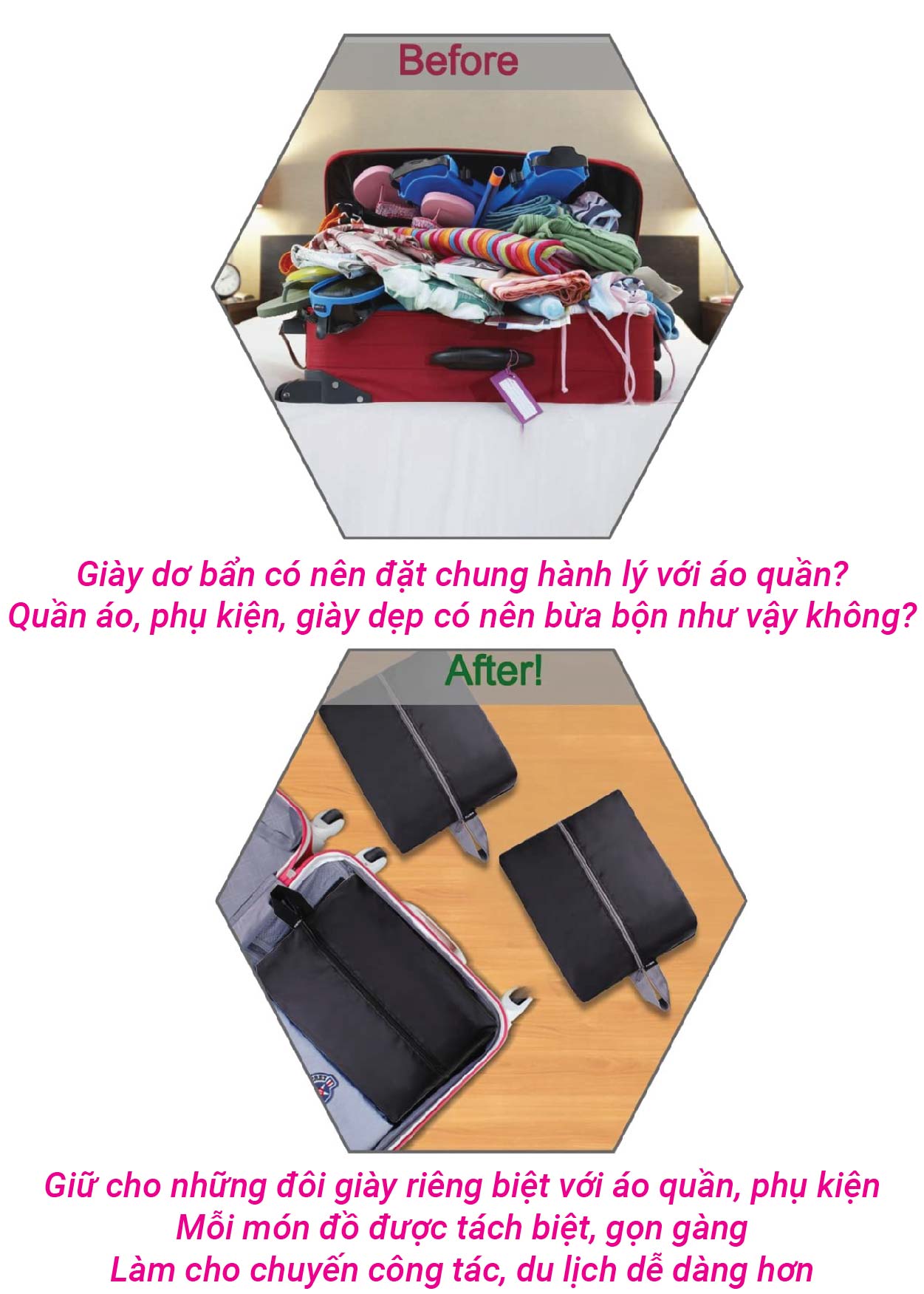 Không chỉ là túi đựng giày, chúng còn là túi đựng đồ tiện ích cho chuyến công tác. Đảm bảo ngăn nắp, gọn gàng, sạch sẽ