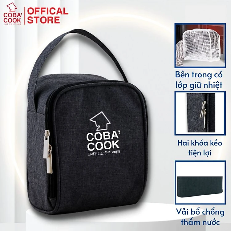 Túi đựng hộp cơm hình vuông logo COBA'COOK- 3 hộp dung tích 370 ml. Giấy bạc giữ nhiệt và 2 khóa kéo tiện dụng-CBS