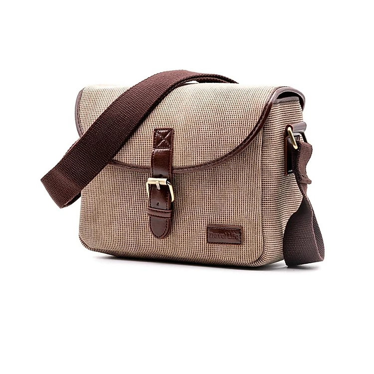 Túi có kích thước: 25cm* 18cm * 12cm. Màu sắc: Vàng kaki và xám. Túi có thể chứa được 1 body kèm lens kit và 1-2 lens zoom tầm trung. Túi có thiết kế kiểu cổ điển, phù hợp cho cả nam và nữ.