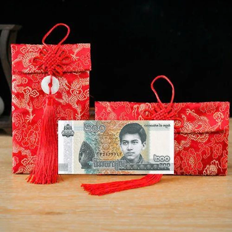 Túi gấm màu xanh loại 200 Cambodia sưu tầm, làm quà tặng