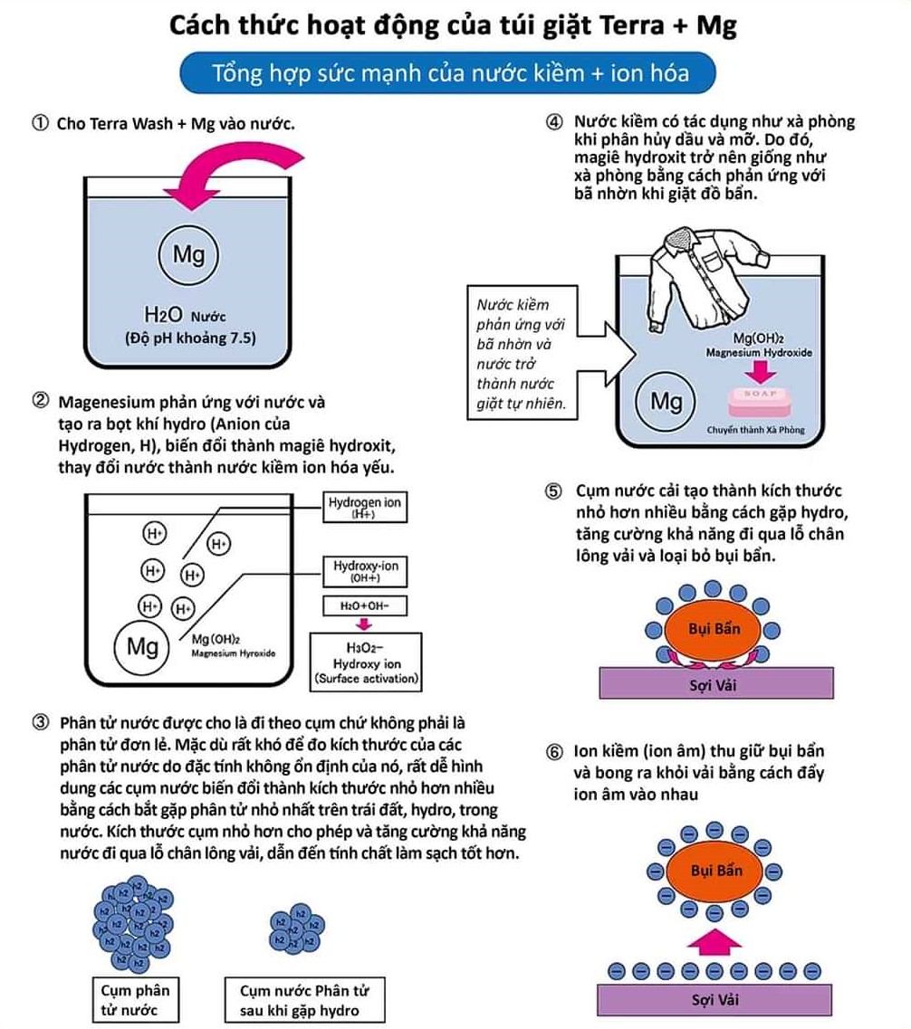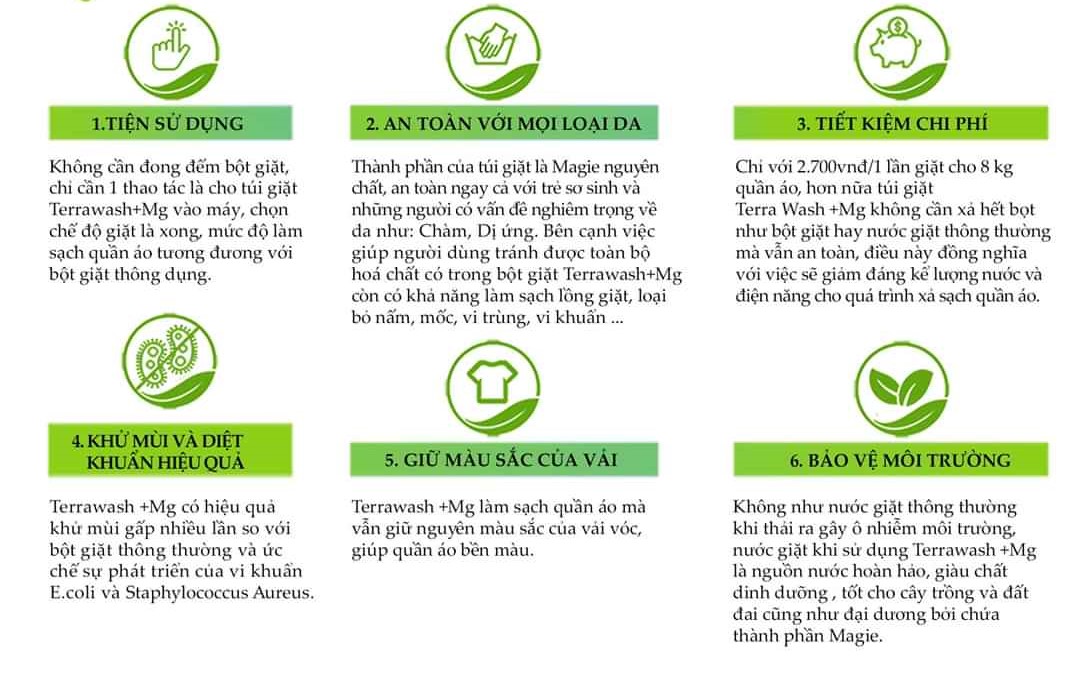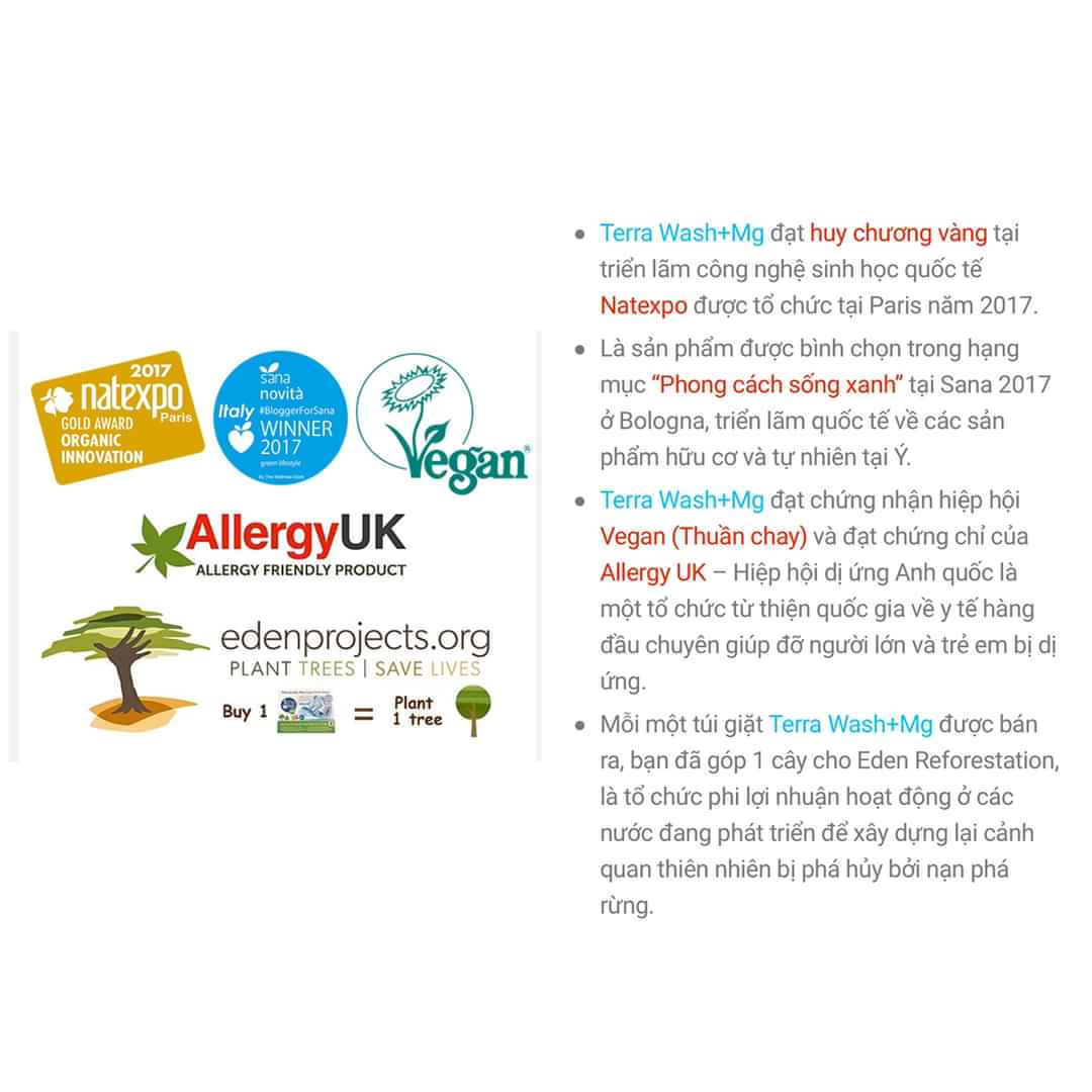 Trong túi giặt quần áo TERRA WASH +MG có chứa 99,95% là các hạt Magie, nên lợi ích của túi giặt thông minh: