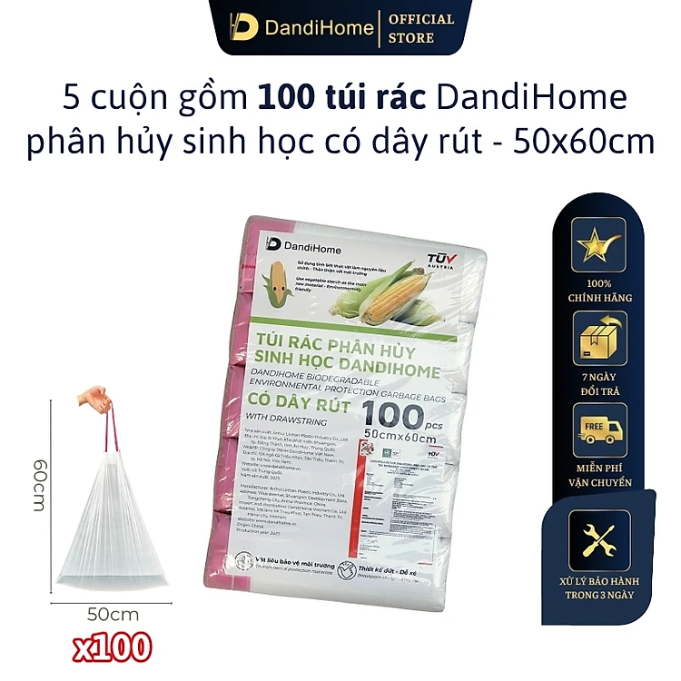 Túi rác, túi đựng rác tự hủy sinh học DandiHome có dây rút, túi rác không gây hại cho môi trường