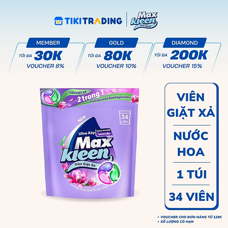 Túi Viên Giặt Xả MaxKleen 2 Trong 1 Hương Nước Hoa Huyền Diệu (34 viên/ túi)
