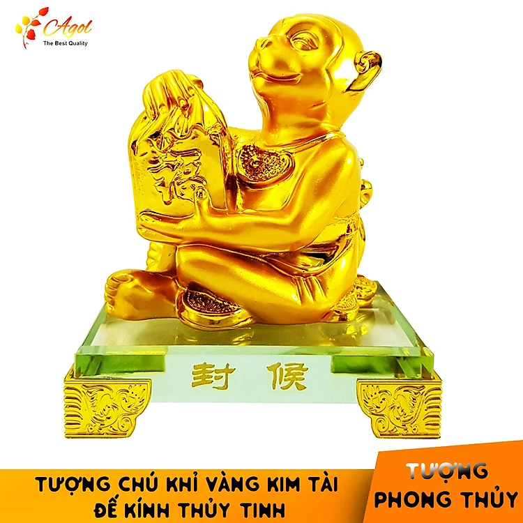 Tượng chú khỉ vàng đế kính thủy tinh cao cấp - Tượng HẦU TÔN ÔM VÀNG