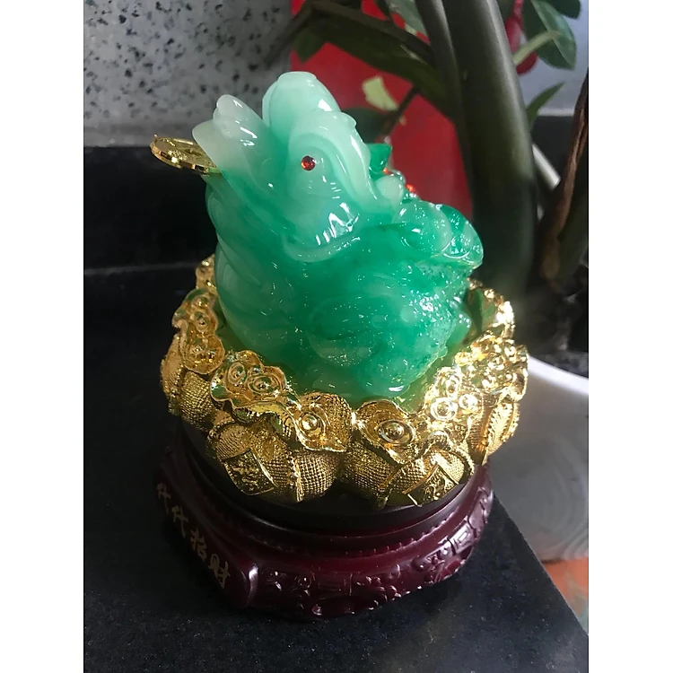 Tượng Cóc Thiềm Thừ Xanh Ngọc Sáng Đẹp Ngậm Tiền Trên Hủ Tiền Thỏi Vàng Đế Gỗ Xoay Size Cao 17cm đk 14cm hợp mệnh mộc mệnh hỏa anh chị để bàn làm việc hay bàn thờ thần tài ạ