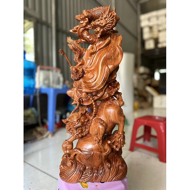 TƯỢNG ĐẠT MA SƯ TỔ TRẤN SƯ TỬ VÀ RỒNG BẰNG GỖ HƯƠNG ĐÁ KT CAO 60×24×14CM