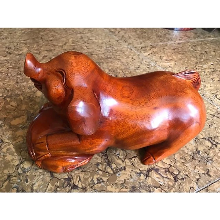 Tượng gỗ mỹ nghệ trạm con heo ôm bao tiền cười vui híp mắt gỗ gõ Dài 30cm x Cao 17cm x Ngang 14cm ý nghĩa biểu tượng giàu sang phú quý ạ