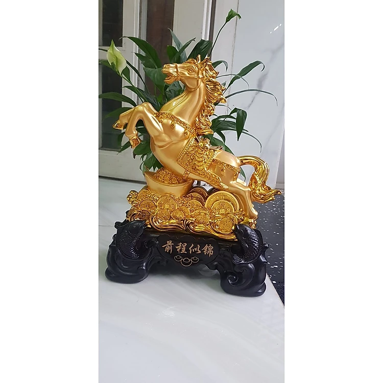 Tượng Ngựa Phong Thuỷ Vàng Đứng Thỏi Xiền Vàng To Đầy Vàng ở dưới 2 Con Cá Chép Ngồi Vẫy đuôi đế gỗ Size cao 36cm x Ngang 27cm x Sâu 15cm Biểu Tượng Mã Đáo Thành Công Tiền Tài Lộc vào Đầy Túi Trưng Phòng Khách Nhà, công ty , quà tặng ý nghĩa ạ