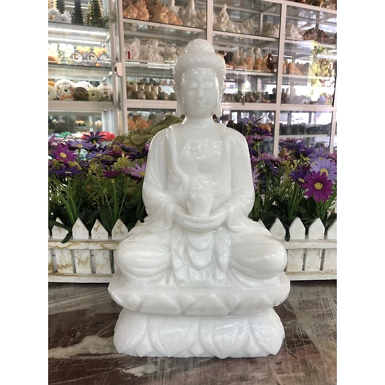 Tượng Phật A Di Đà ngồi đài sen đá cẩm thạch trắng - Cao 30 cm