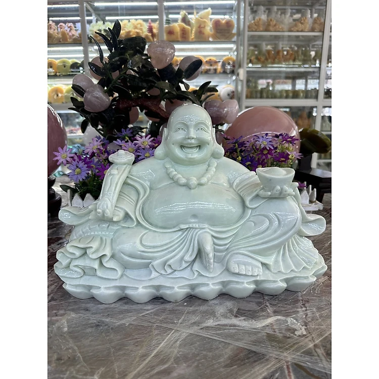 Tượng Phật Di Lặc cầm gậy như ý đá cẩm thạch trắng xanh - Dài 40cm - Đá Phong Thủy TH