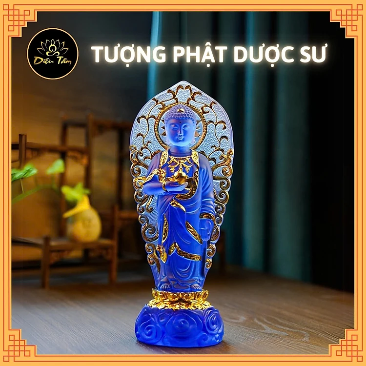 Tượng phật dược sư lưu ly tượng dược sư đứng hào quang xanh dương trang trí 23cm phong thủy, thờ cúng Diệu Tâm