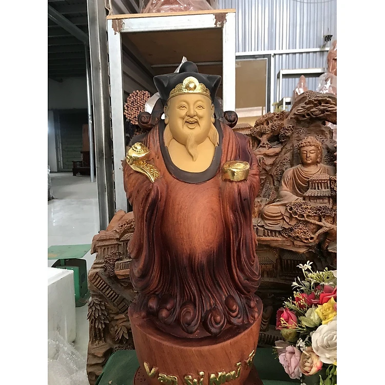 Tượng phật ông thần tài hoan hỷ bằng gỗ hương đá liền khối tô làm mầu giả cổ kt 60×22×15cm