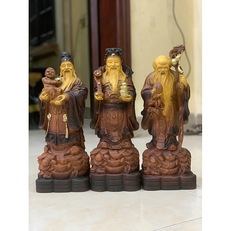Tượng phật tam đa phúc lộc thọ bằng gỗ hương đá tô làm mầu giả cổ kt 40×15×13cm