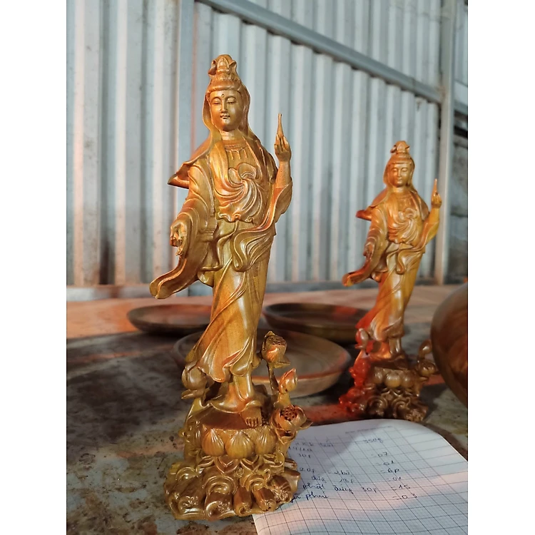 Tượng quan âm bồ tát được làm bằng chất liệu gỗ bách xanh thơm nức kt cao 30×8×9cm
