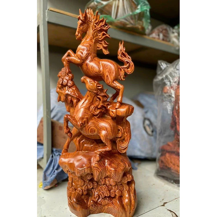 Tượng song mã uyên ương gỗ hương đá kt 60×29×15cm