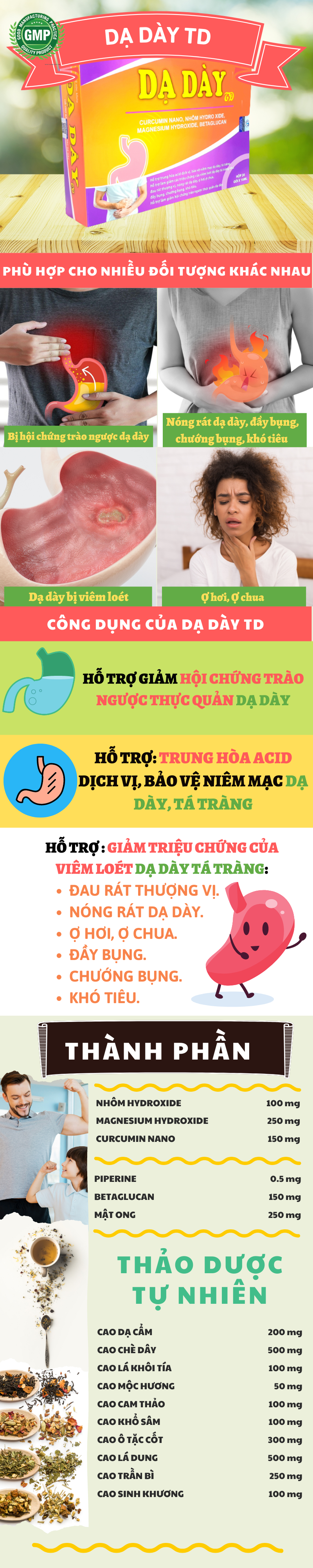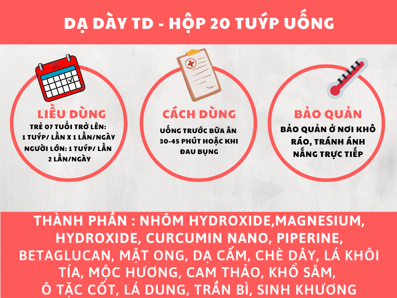 Sản phẩm Dạ Dày TD hỗ trợ trung hòa acid dịch vị, bảo vệ niêm mạc dạ dày, tá tràng. Dạ dày TD hỗ trợ làm giảm các triệu chứng của viêm loét dạ dày, tá tràng như: đau rát thượng vị, nóng rát dạ dày, ợ hơi, ợ chua, đầy bụng, chướng bụng, khó tiêu. Ngoài ra, sản phẩm Dạ dày TD hỗ trợ làm giảm hội chứng trào ngược thực quản dạ dày.