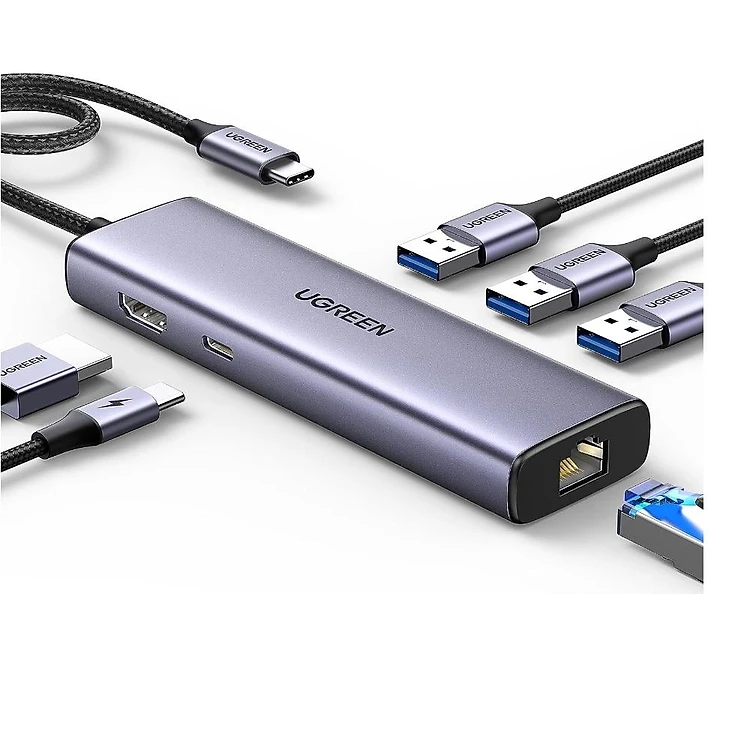 Ugreen UG15598CM512TK USB type C sang 1 x HDMI 4K30Hz + 3 x USB 3.0 + 1 x RJ45 1Gbps + 1 x USB-C PD100W Bộ chuyển 6in1 - HÀNG CHÍNH HÃNG
