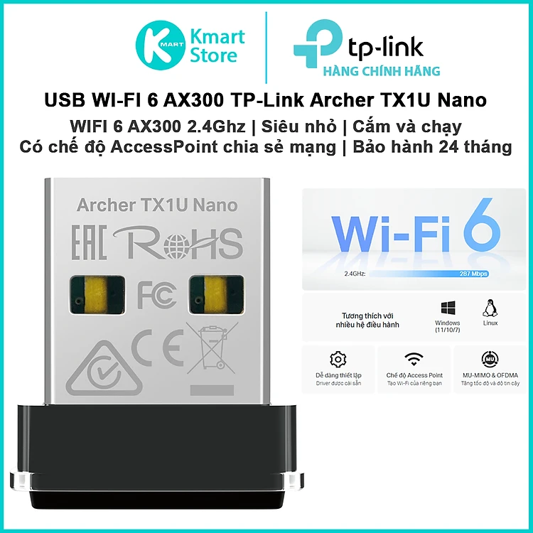 USB WIFI 6 TP-Link Archer TX1U Nano | AX300 2.4Ghz | Cắm và chạy | AP Mode | Bảo hành 2 năm | Hàng Chính Hãng