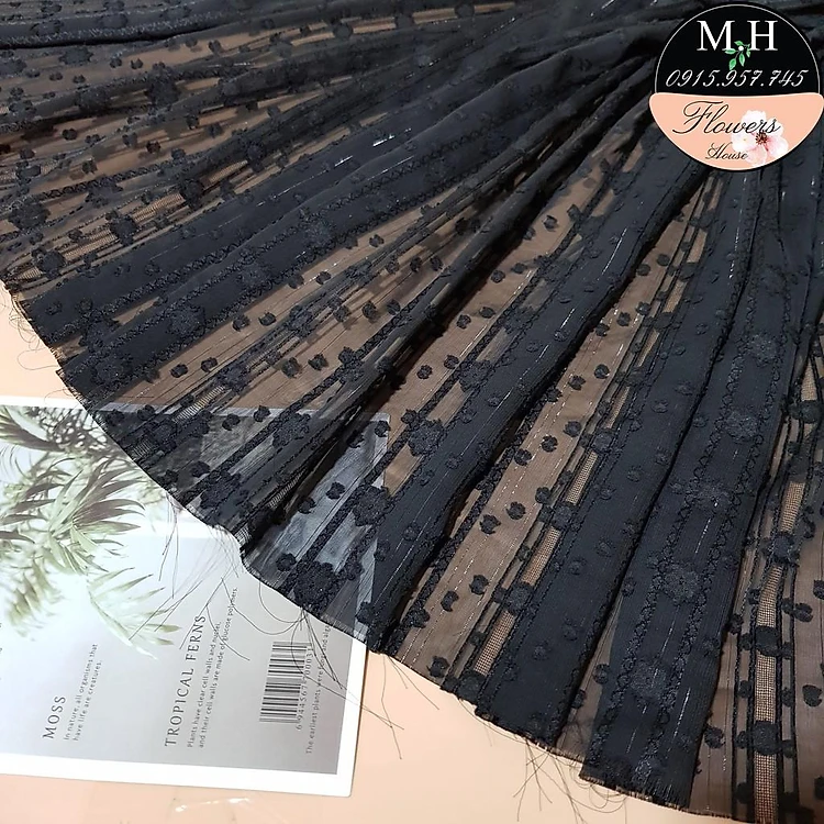 Vải ren đen thêu hoa mai nổi 6 cánh (100cmx150cm) ren may váy áo, trang trí đồ thủ công