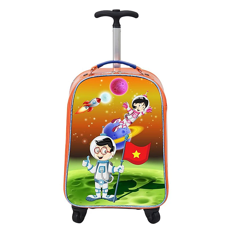 • Thiết kế hình ảnh những trẻ em đang phiêu lưu và khám phá vũ trụ, kết hợp cùng màu sắc tươi sáng và sinh động, dành cho bé yêu thích những nhân vật tưởng tượng nhưng hết sức gần gũi với đời sống thường ngày, yêu thích những câu chuyện ngụ ngôn thời hiện đại. Bé có thể tự khám phá hoặc viết nên câu chuyện riêng về người bạn đồng hành của mình là các nhân vật được thể hiện trên hình mặt trước vali.