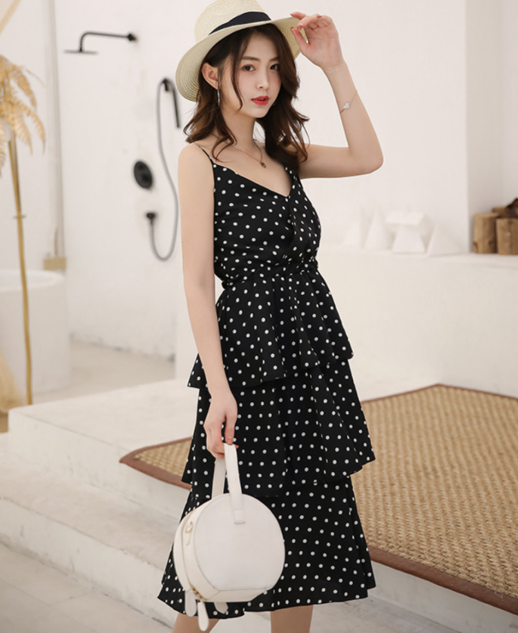 Váy Ba Tng Hai Dây Chm Bi MAY_DN051