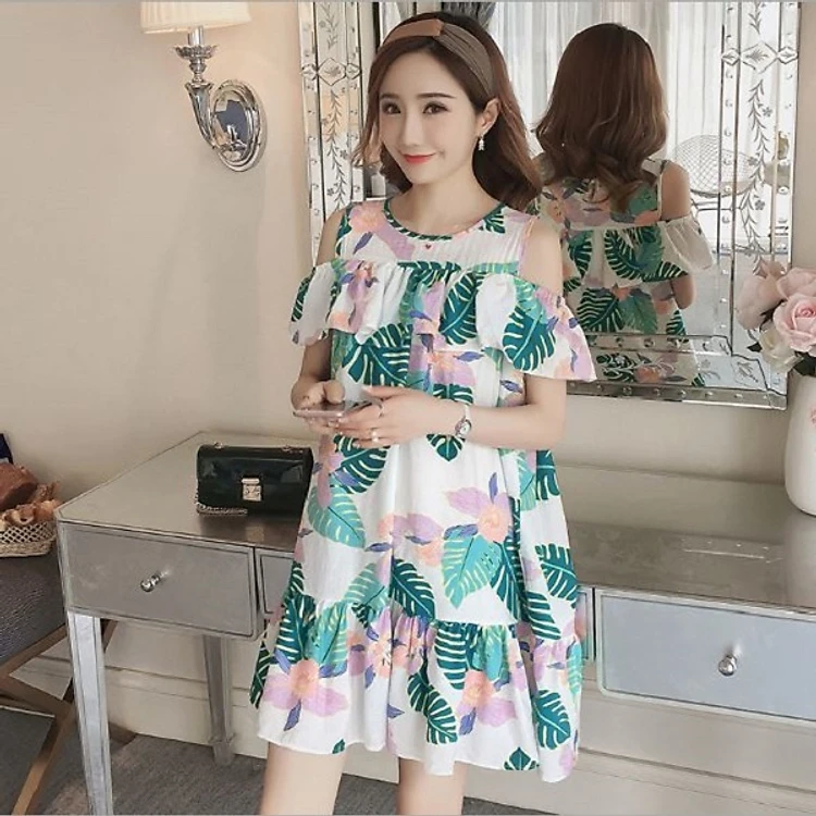 Váy bầu, đầm bầu hở vai họa tiết xanh lá