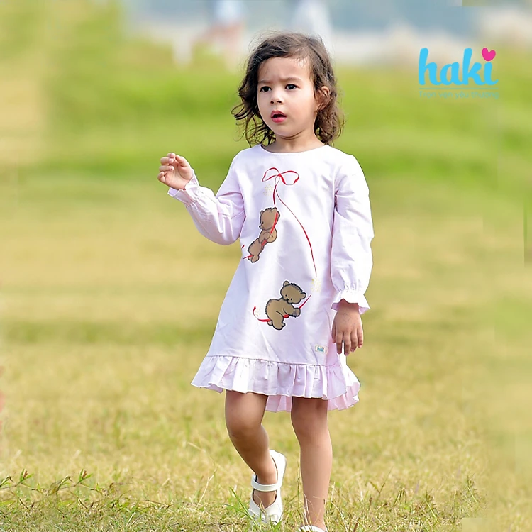 Váy bé gái suông chữ A in gấu tay chun Haki