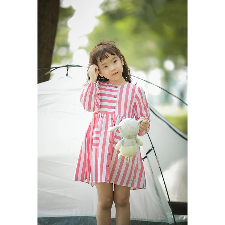 Đầm bé gái kẻ dài tay hai túi ốp Haki - Kẻ đỏ