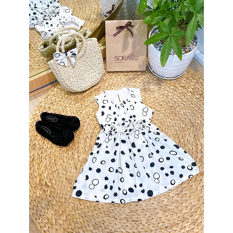 Váy Đầm Bé Gái Chấm Bi Đen Ba Bông Hoa Trắng SoraChan - M034