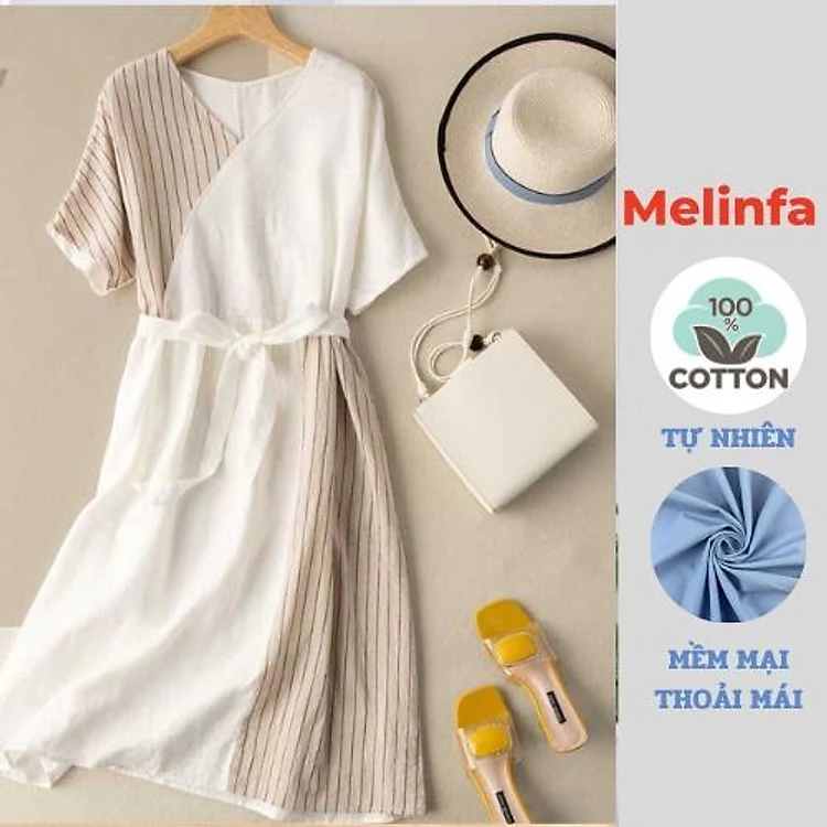 Váy đầm nữ cổ V trẻ trung thanh lịch có đai thắt kèm dáng dài vải Cotton Linen tự nhiên mã VAV0328