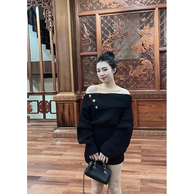 Váy Len Body Trễ Vai Phối Nút Tay Dài Dáng Ôm Sang Chảnh, Tôn Dáng Quyến Rũ