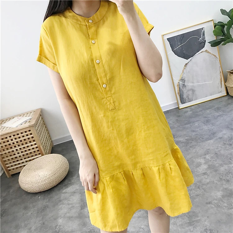 Váy linen dáng đuôi cá, Đầm Hè Linen nữ cổ trụ đóng cúc, ngắn tay thời trang hè nữ Haint Boutique Da80
