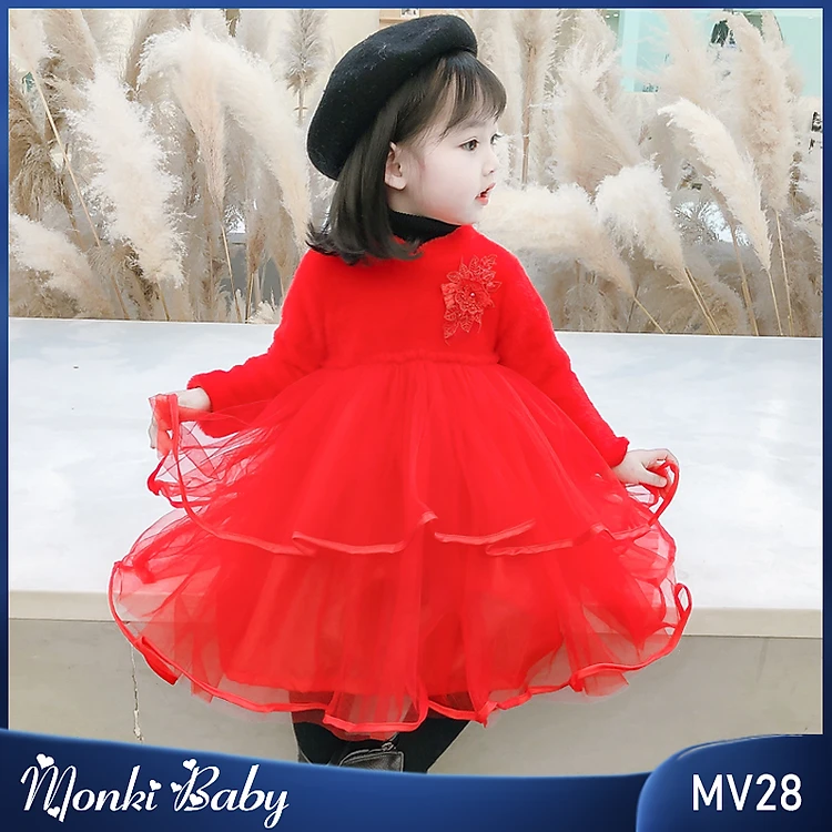 Váy công chúa lót lông chân bồng xinh dày ấm cho bé gái diện Tết, chất vải lông mềm mượt, chân ren 2 tầng sang chảnh | MV28