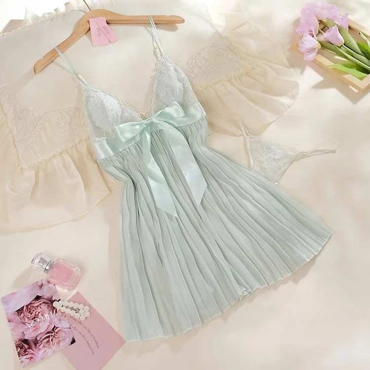 Váy Ngủ D177 Ren Xếp Ly Cột Nơ Kèm Chip Xinh Xắn