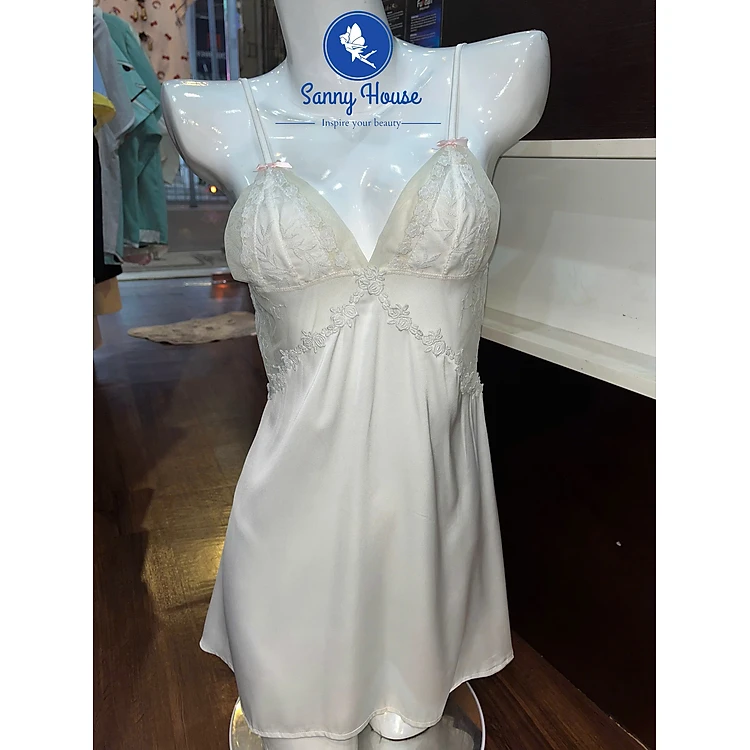 Váy Ngủ D661 Lụa Quảng Châu Phối Ren Lưới Đính Nơ Xinh Xắn