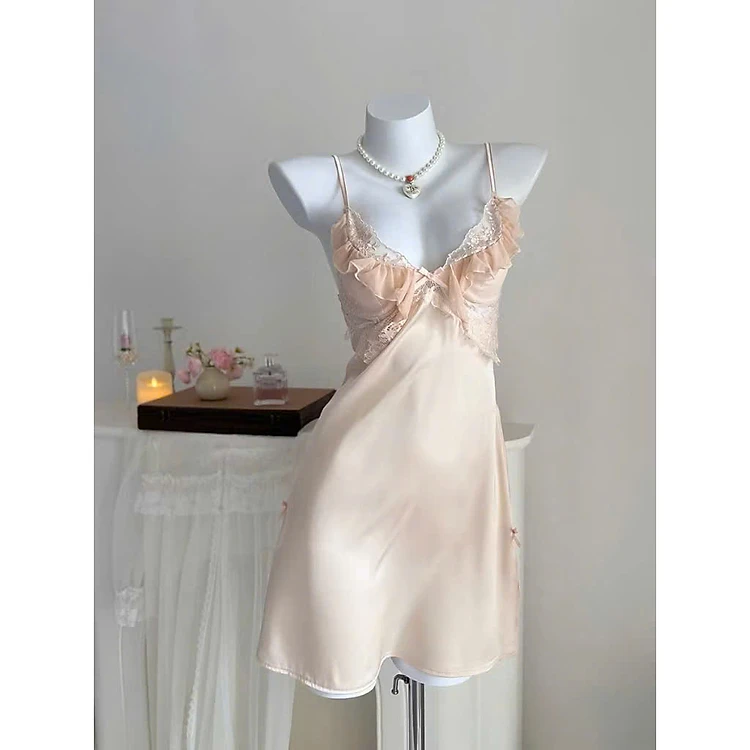 Váy Ngủ D721 Lụa Quảng Châu Cao Cấp Đính Nơ Viền Bèo Tiểu Thư Xinh Xắn