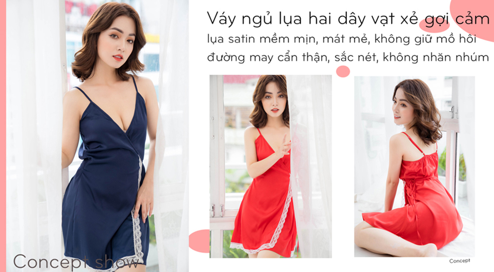 Váy ngủ lụa hai dây vạt chéo ren trắng cao cấp N217