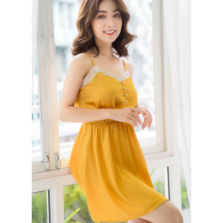 Váy ngủ lụa satin hai dây chun eo dáng xòe cao cấp N200