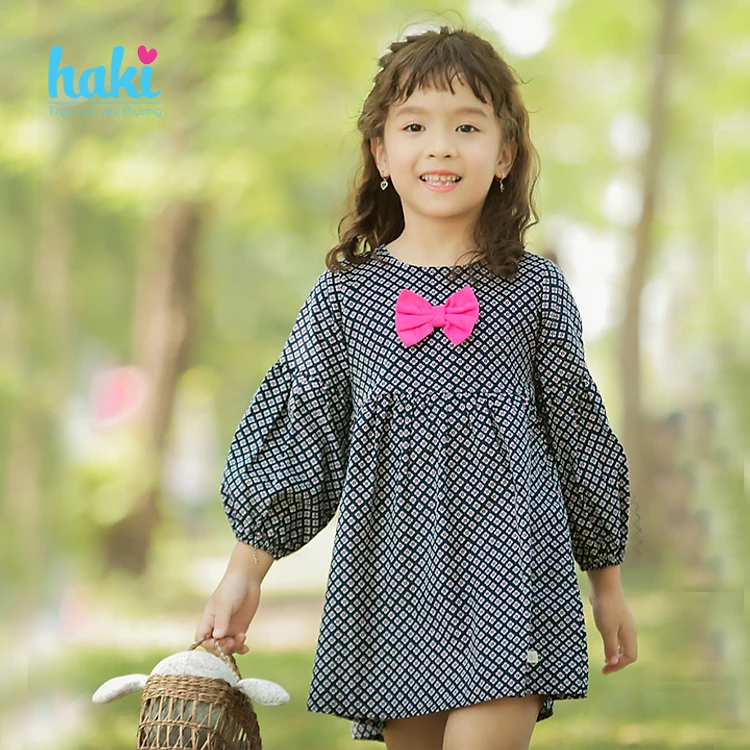 Váy bé gái nhung tay bồng Haki - Xanh than hoa vuông