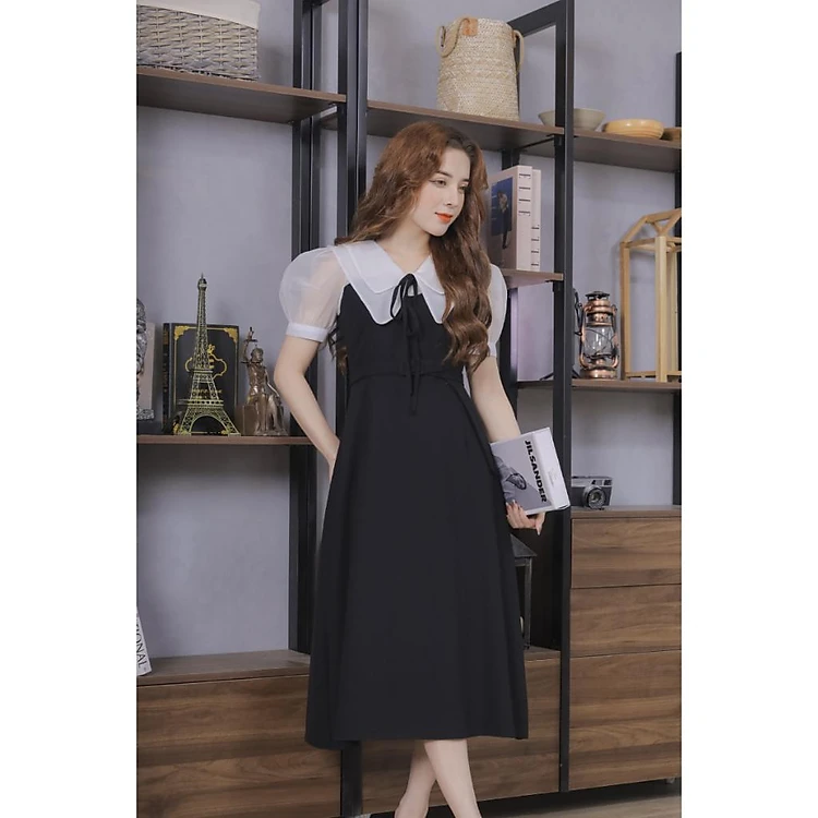 Váy Nữ Cổ Phối Tơ Voan Màu Đen 23V037 Pi Style