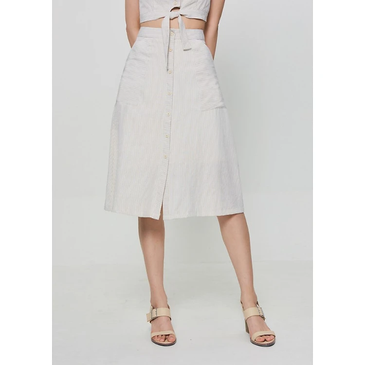 - Váy Nữ Midi Nẹp Nút 2 Túi Sọc Marc Fashion PN074018 - Kem có kiểu dáng thời trang, tinh tế.