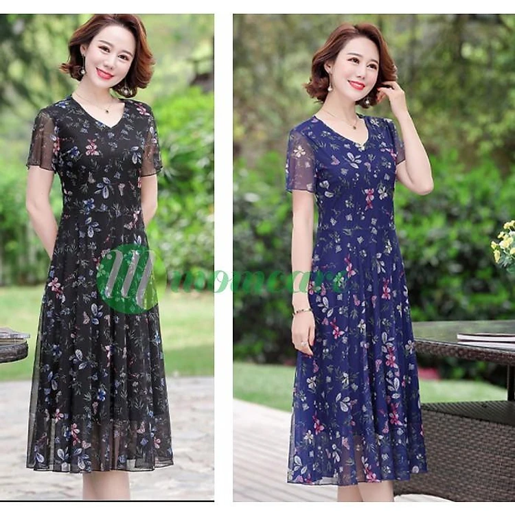 Váy nữ trung niên cho mẹ Voan V74, Áo đầm trung tuổi thời trang mùa hè đẹp cao cấp sang trọng dự tiệc dạ hội U40 U50 U60 U70 Bigsize cho người mập