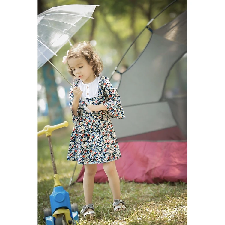 Váy bé gái phối ngực tay chuông Haki - Hoa gấu