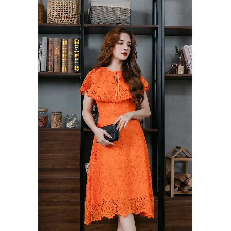 Váy Ren Bèo Cổ Màu Cam 23V005 Cao Cấp Pi Style