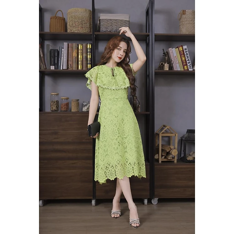 Váy Ren Bèo Cổ Màu Xanh Cốm 23V004 Cao Cấp Pi Style